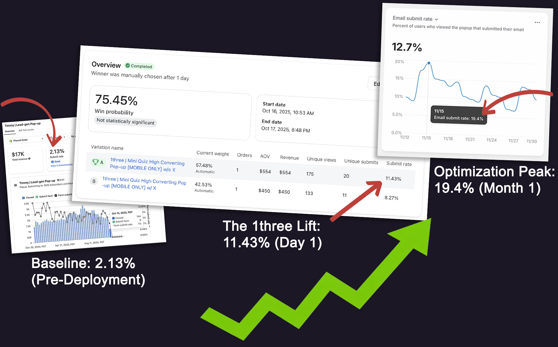 Most brands accept a 1-2% opt-in rate as 'good' or 'industry standard.' We proved that's a myth. By re-engineering this brand’s top-of-funnel UI/UX, we took their 2.13% baseline to an 11.43% email submit rate practically overnight. Through continuous optimization, we reached a sustained average of 12.7%, with peak engagement days hitting 19.4%. That is a 6x to 9x multiplier on their daily lead flow for the exact same ad spend.